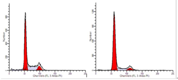 PI ,即碘化丙锭,可以与细胞内DNA 和RNA 结合,采用RNA酶将RNA消化后,通过流式细胞术检测到的与DNA 结合的PI的荧光强度直接反映了细胞内DNA含量的多少。由于细胞周期各时相的DNA 含量不同,通常正常细胞的 G0/G1 期具有二倍体细胞的DNA 含量(2N) ,而G2/ M 期具有四倍体细胞的DNA 含量(4N) ,而S 期的DNA含量介于二倍体和四倍体之间。