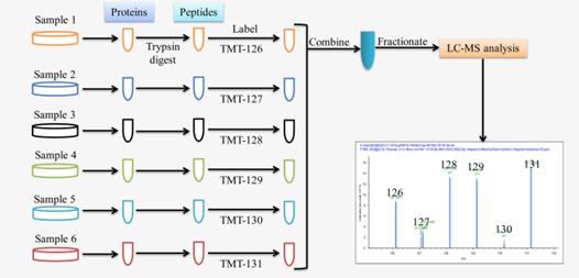 3、用不同质量数的iTRAQ/TMT标签分别对肽段样品进行标记: